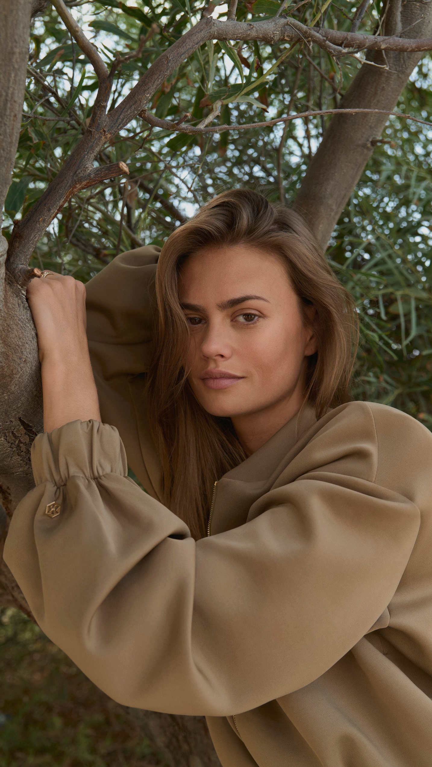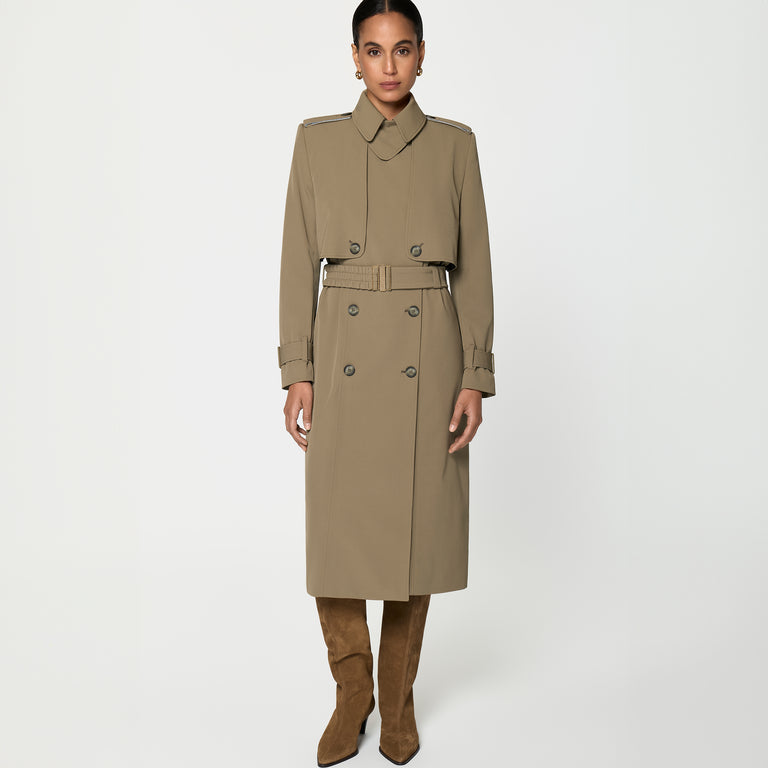 Sharp shoulders. Statement cape. Water-repellent stretch fabric. The CORLEON Trench Coat brings refinement to every occasion, designed for women in motion.