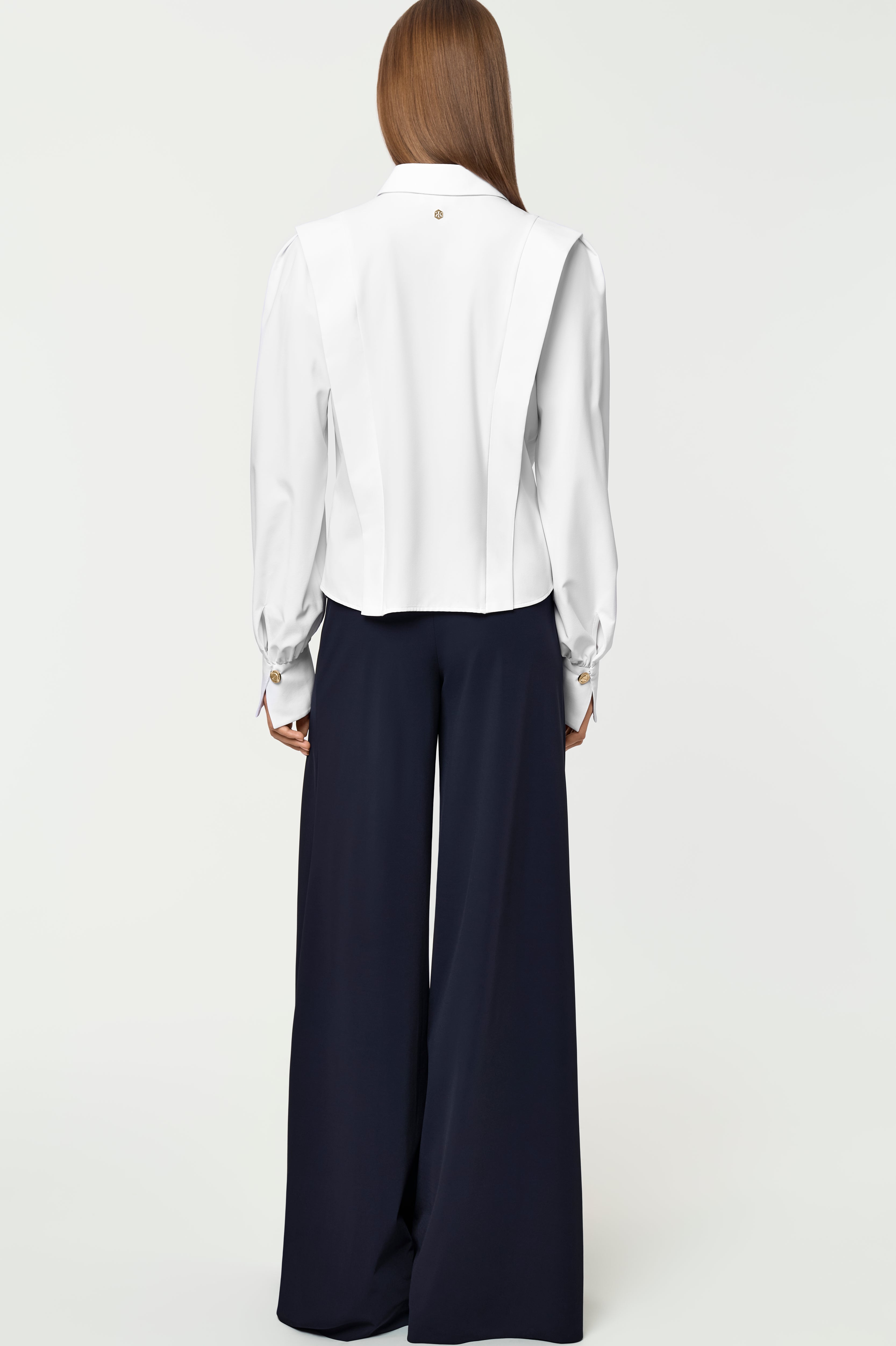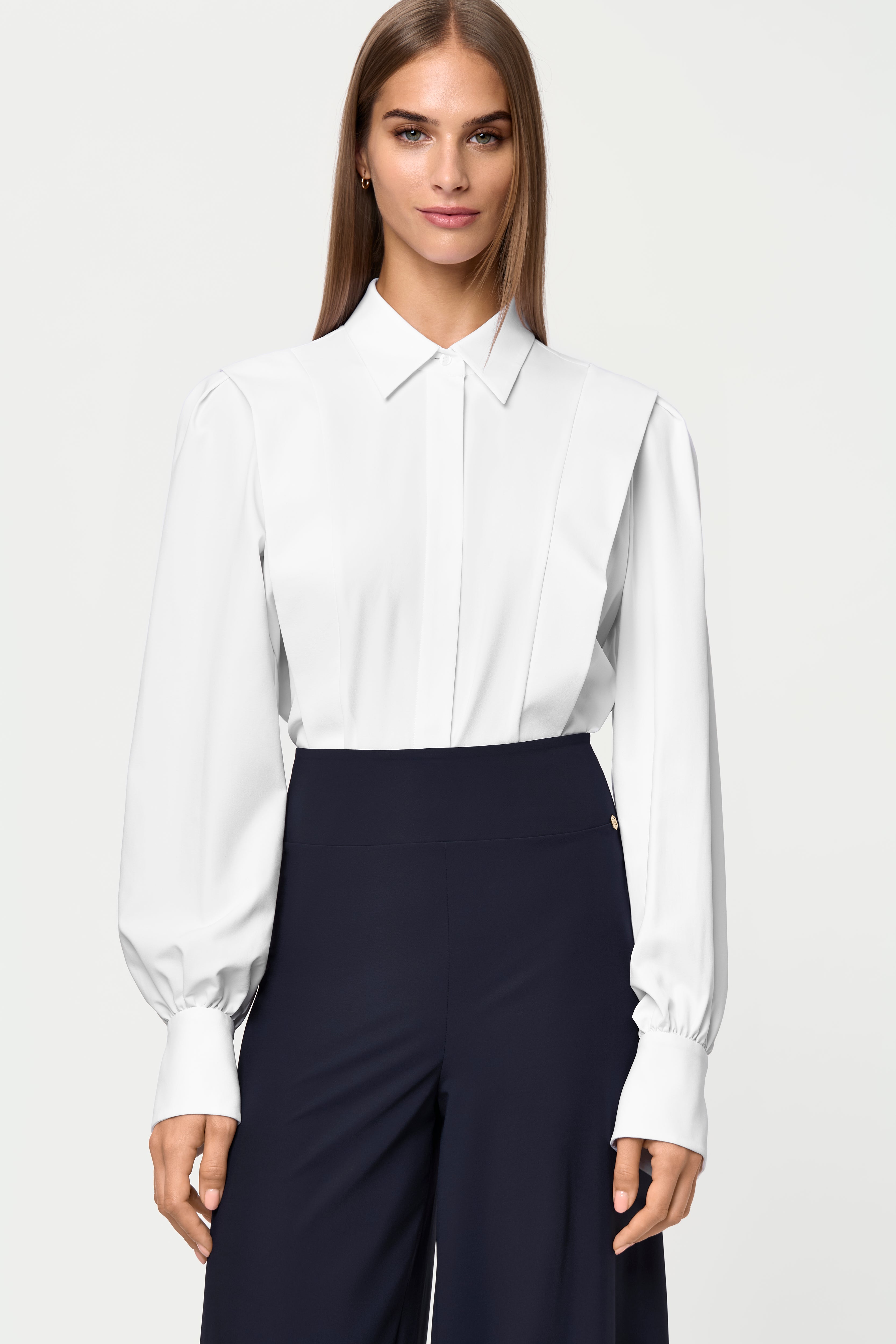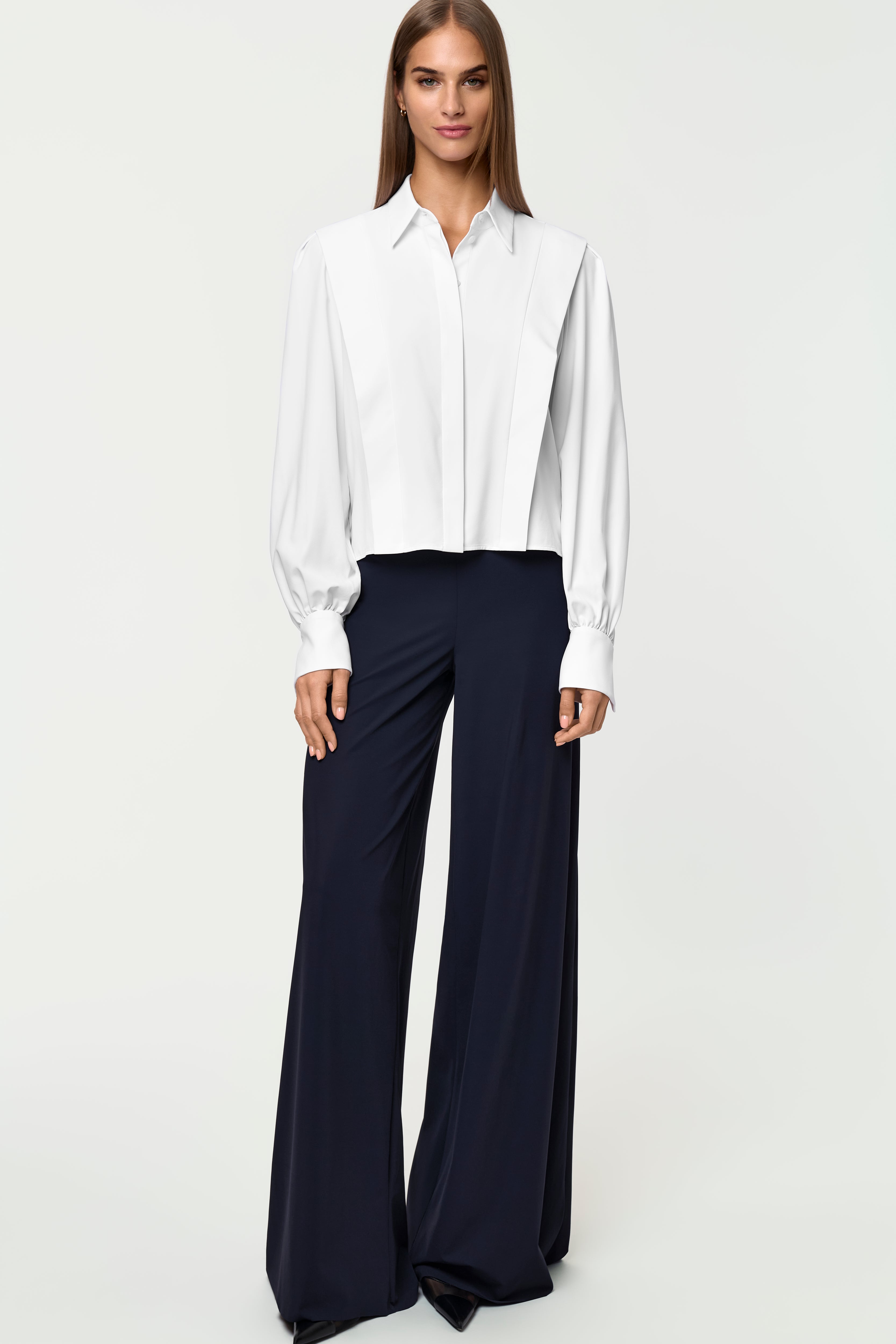 The PALERMA Shirt, in feather-light X10 fabric, offers breathability, quick-drying ease, and a soft, luxurious feel. Vertical panels enhance its elongated silhouette, while a hidden placket and structured collar add refined simplicity. Box-pleated shoulders and gathered sleeves flow into tailored cuffs finished with golden buttons. Named after Palermo, it captures relaxed coastal elegance. Pair it with the SINAM Pants deep navy for relaxed sophistication.